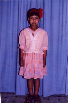 Family History (why admitted to home): Came at the age of two after staying in a refugee camp for one year due to the gas mishap of Bhopal. Was brought by an aunt after her father left due to a family quarrel.